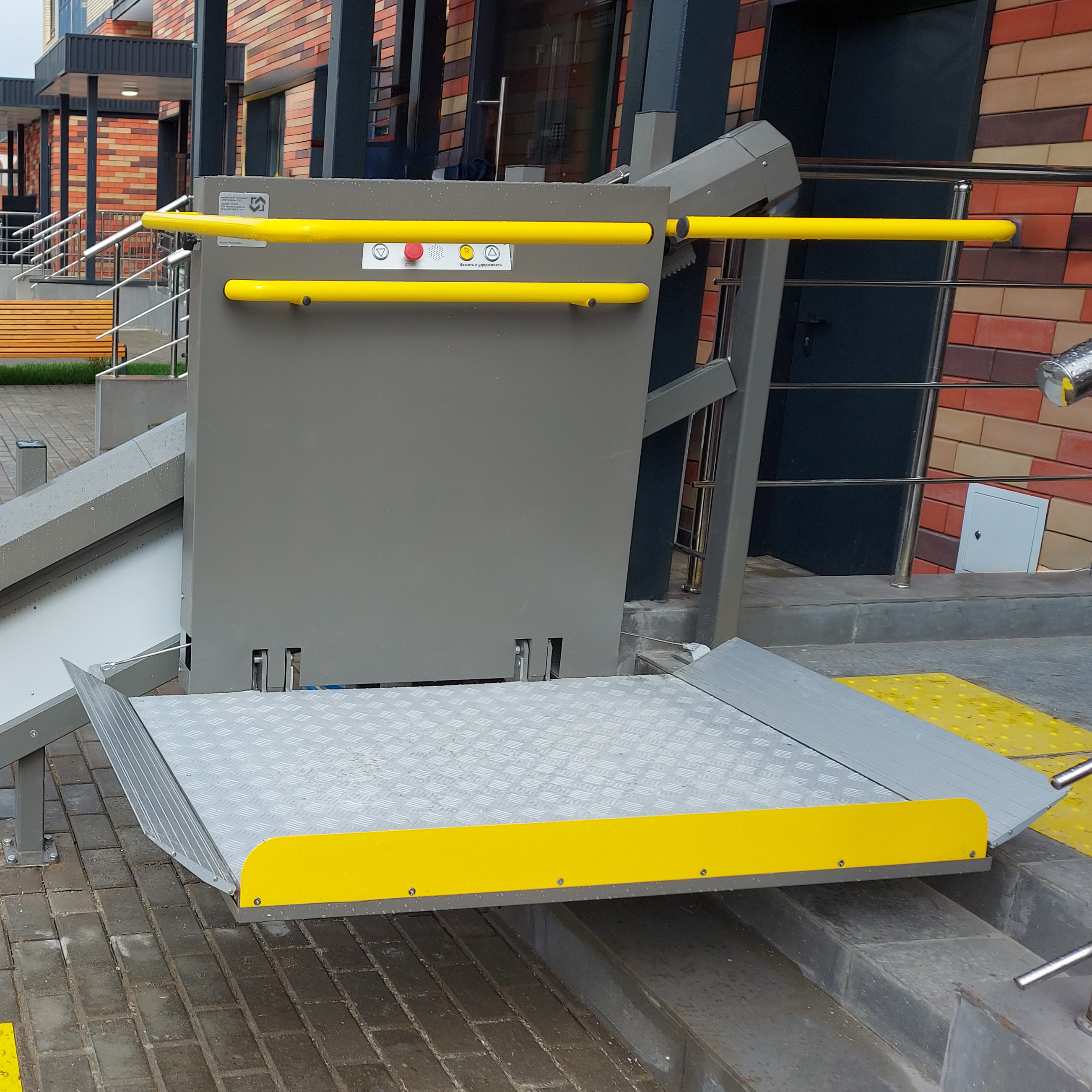 - Откидными пандусами и поручнями, которые препятствуют скатыванию кресла-коляски во время движения подъемника.