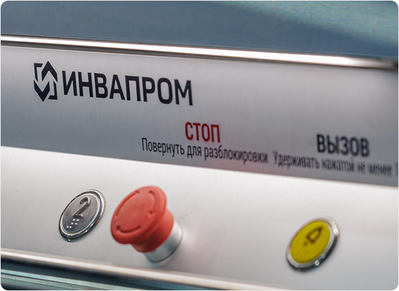 Это кнопка, которую нужно держать нажатой всё время движения платформы. Такое требование безопасности прописано в ГОСТ: подъемник ИНВАПРОМ А1 движется только при удержании кнопки, что исключает несанкционированные и опасные движения.
