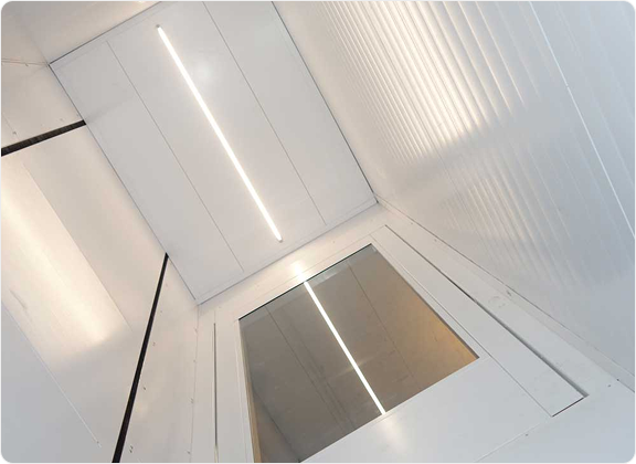 - Шахта из сэндвич панелей или секций со стеклом - самонесущая конструкция позволяет отказаться от возведения строительной шахты.
