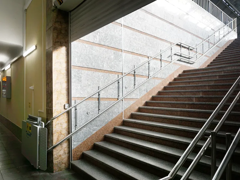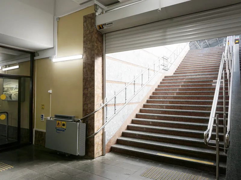Одна подъемная платформа с вертикальным перемещением МУЛЬТИЛИФТ установлена рядом с лестницей, ведущей к билетным кассам.