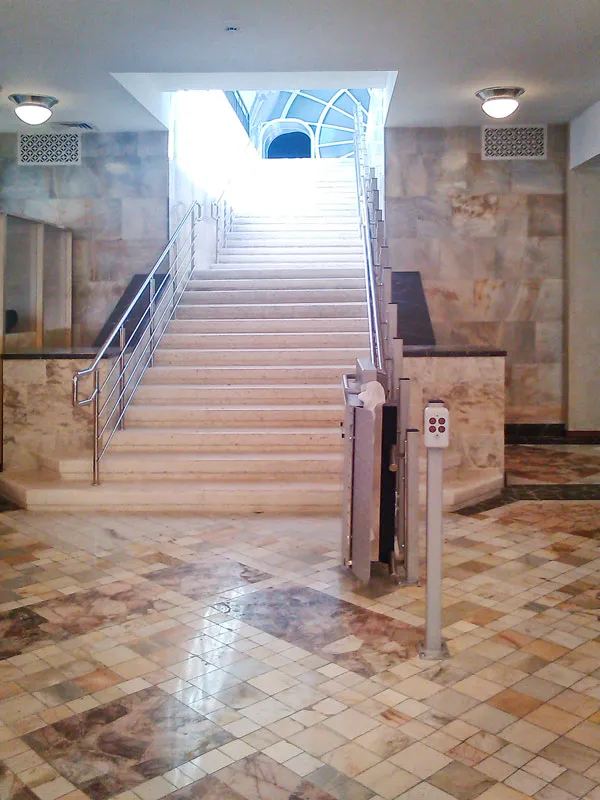 Подъемник имеет сложную траекторию движения и подходит для лестниц с поворотами и площадками перепрохода.